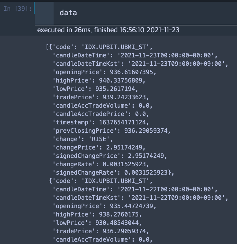import requests days = 30 # 최근 n일의 데이터 수집 idx = 'UBMI' # 인덱스명 url = 'https://crix-api-cdn.upbit.com/v1/crix/candles/days?code=IDX.UPBIT.' + idx + '&count=' + str(days) response = requests.get(url) data = requests.get(url).json()days의 숫자에 따라서 최근 몇일치의 데이터를 수집할 것인지가 결정되고,